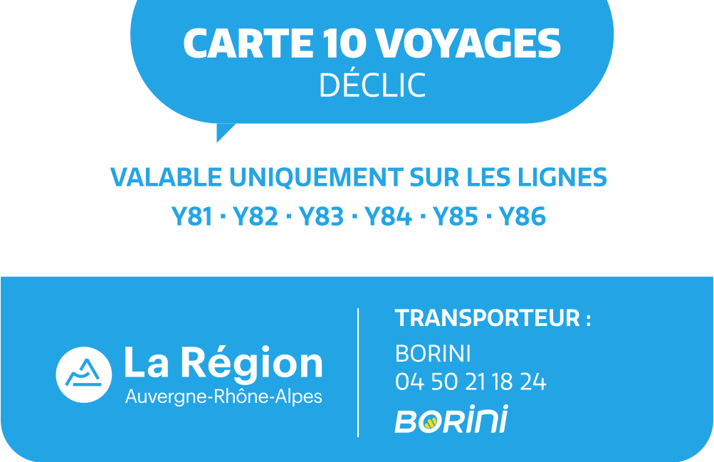 - Montant: 6,5 euros pour une recharge de 10 voyages Déclic - contient 10 trajets d’une validité de 2h (correspondances autorisées dans la limite de 2h après la première validation) - réservé aux titulaires d’une carte Déclic délivrée par la Région Auvergne Rhône Alpes ou d’une carte scolaire délivrée par la CCPMB (carte à présenter à bord) |